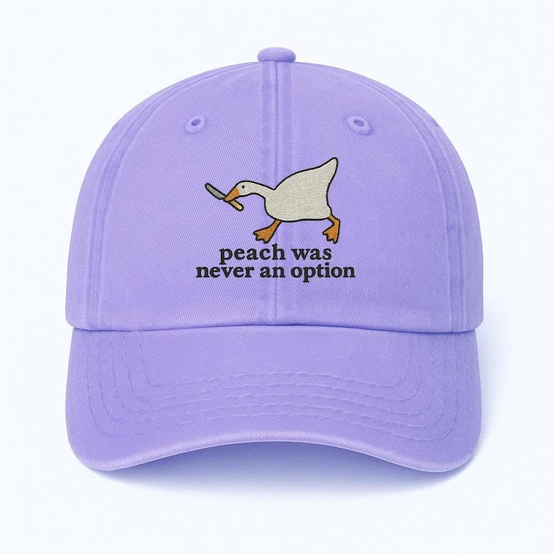 Our “Peach Was Never an Option” hat features a mischievous duck holding a knife – the ultimate chaotic good energy. Embroidered on a high-quality, pigment-dyed cotton cap, it’s a must-have for meme lovers, gamers, or anyone who enjoys a good laugh with their outfits.