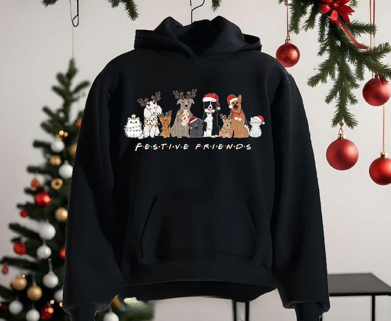 Merry Christmas Hoodie, Christmas Hoodies, Christmas Jumper, Christmas Jumpers For Women, Xmas Jumper, Santa ,Doggy Friends (Hoodie)